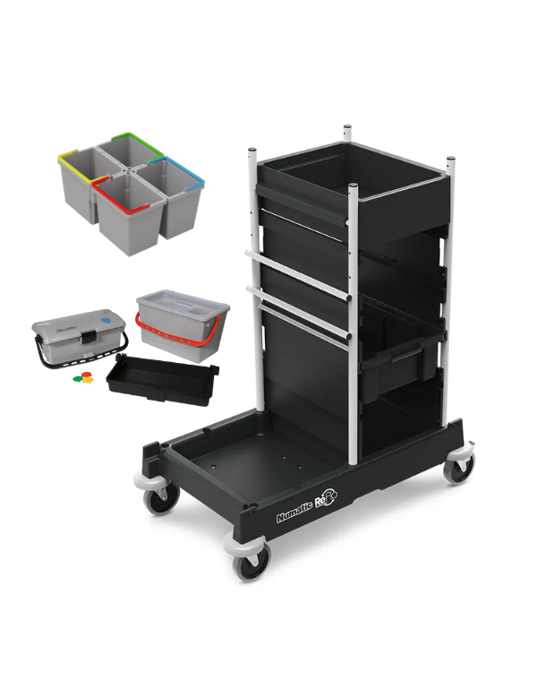 System SRK4 w wózkach Numatic SM0 stworzony został specjalnie z myślą o dezynfekcji. Dzięki zastosowaniu dodatkowych wiader oraz odpowiedniego układu, użytkownik zyskuje pełną kontrolę nad procesem mycia i dezynfekcji powierzchni. Razem z SRK 21 tworzą kompletny system do mycia i pielęgnacji podłóg w obiektach wymagających profesjonalnych standardów czystości.